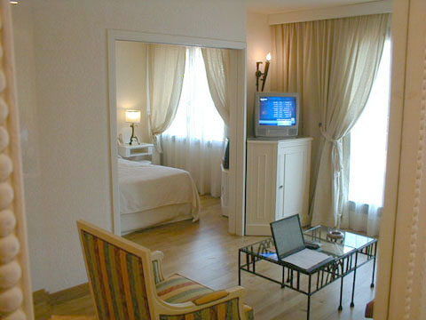 Le séjour est équipé d’un coin salon avec fauteuil et bergère, consoles, table et chaises, réfrigérateur minibar, deuxième télévision, lecteur DVD.